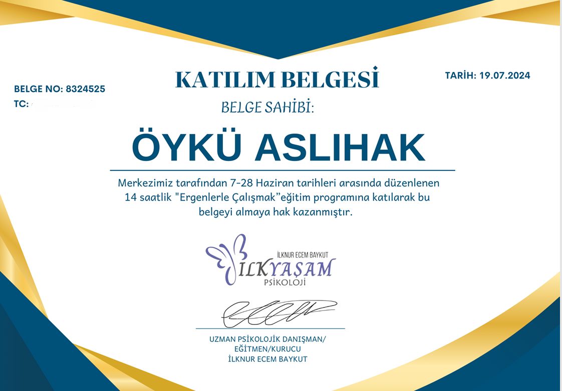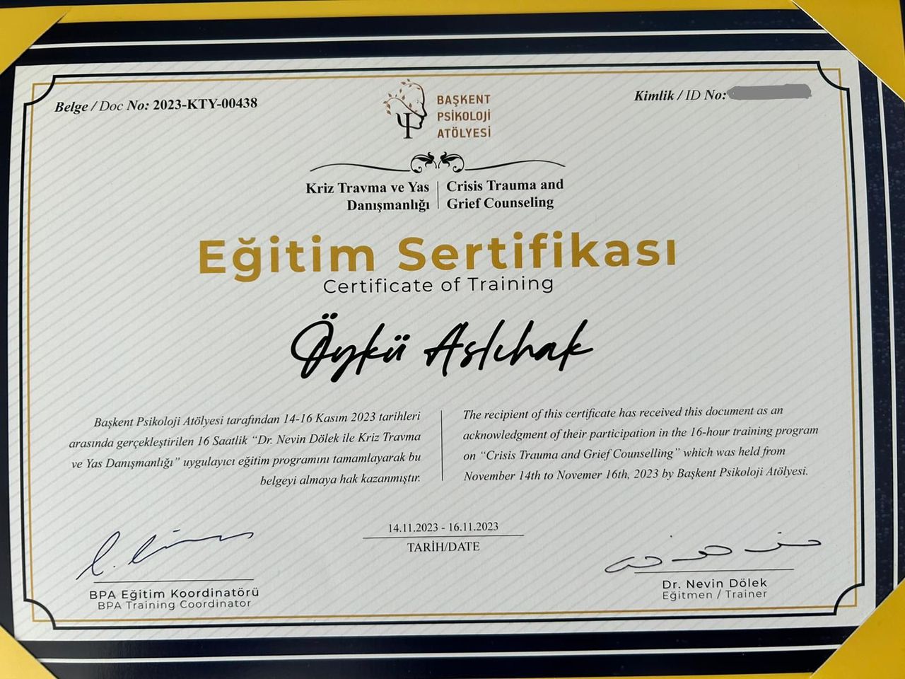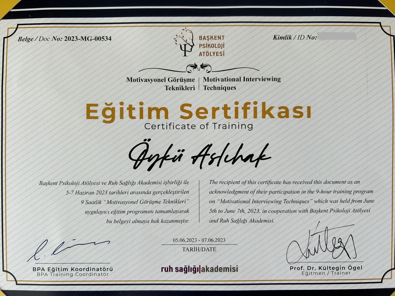 Aldığı Eğitimler: Bilişsel Davranışçı Terapi Uygulayıcı Eğitimi, Sorunlarımızı Çözelim Programı Uygulayıcı Eğitimi, Evlilikte Çözüm Odaklı Danışmanlık Programı Uygulayıcı Eğitimi, Motivasyonel Görüşme Teknikleri, Kriz, Travma ve Yas Danışmanlığı, Kısa Süreli Çözüm Odaklı Terapi, Duygu Düzenleme Eğitimi.