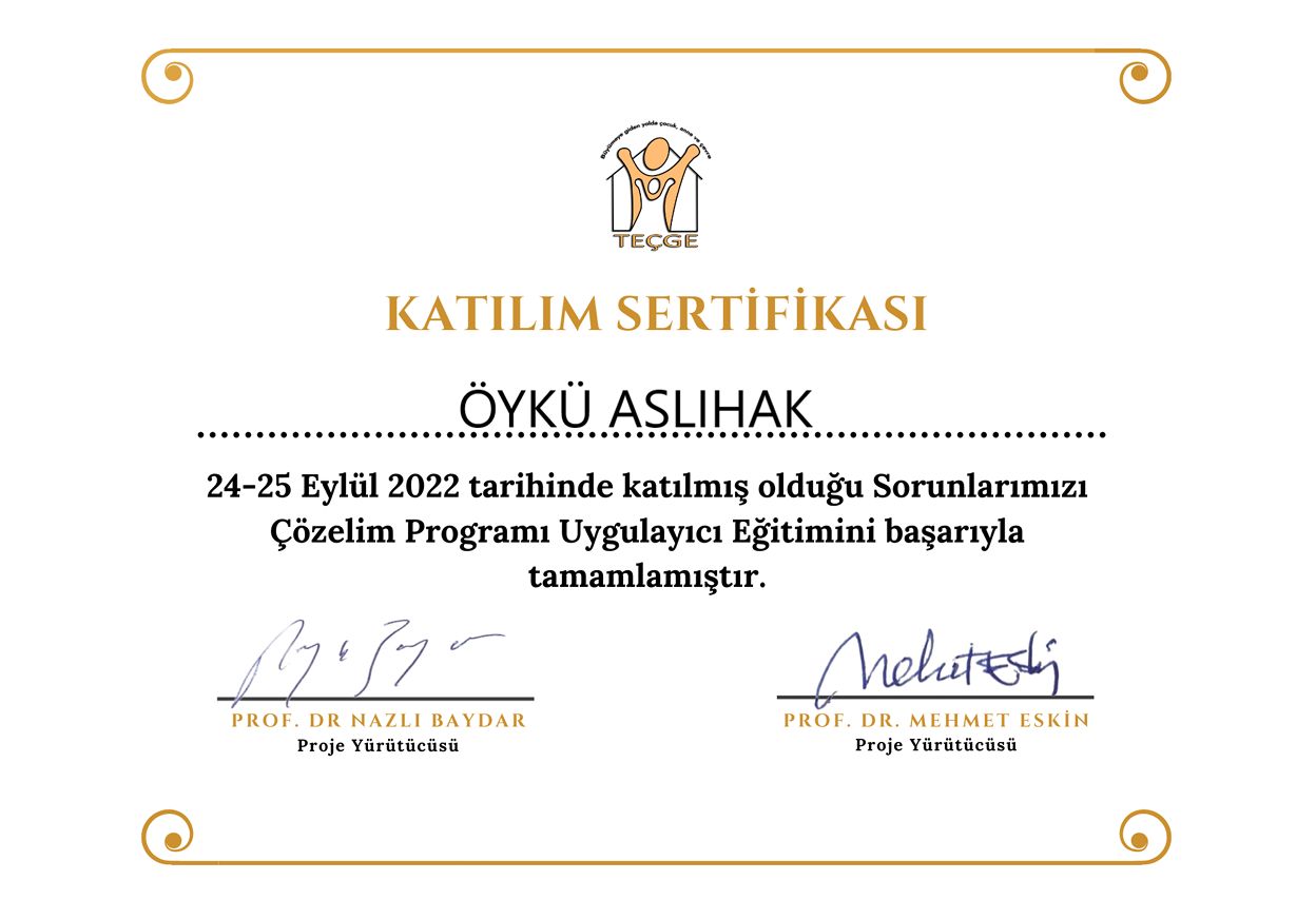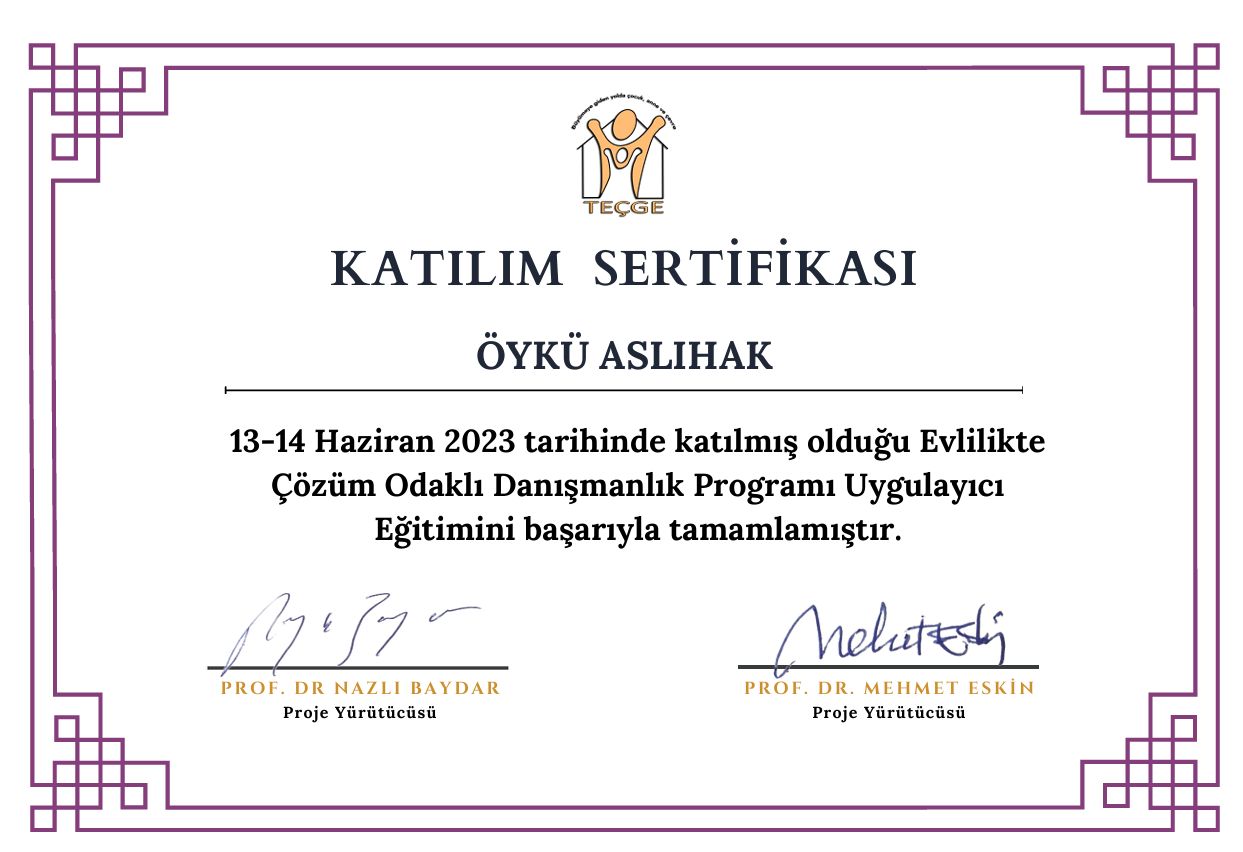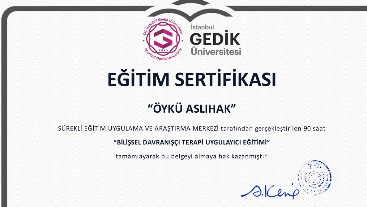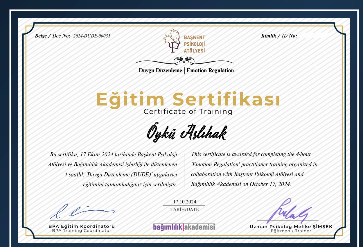 Aldığı Eğitimler: Bilişsel Davranışçı Terapi Uygulayıcı Eğitimi, Sorunlarımızı Çözelim Programı Uygulayıcı Eğitimi, Evlilikte Çözüm Odaklı Danışmanlık Programı Uygulayıcı Eğitimi, Motivasyonel Görüşme Teknikleri, Kriz, Travma ve Yas Danışmanlığı, Kısa Süreli Çözüm Odaklı Terapi, Duygu Düzenleme Eğitimi.